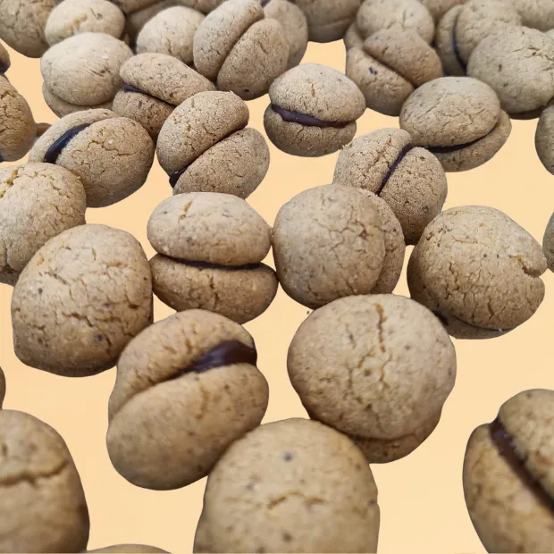 Ingredienti: margarina, zucchero, zucchero di canna, polvere di MANDORLE, polvere di NOCCIOLE, TUORLO, farina di riso, cioccolato (pasta di cacao, burro di cacao, lecitina di soia, aroma naturale di vaniglia). (Allergeni: 3, 8)