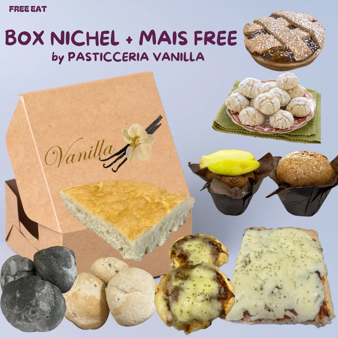 Box nichel free, mais free e senza glutine con prodotti da forno artigianali dolci e salati. Perfetta per chi ha intolleranza al nichel, al mais e al glutine e desidera un assortimento completo, sicuro e gustoso per ogni momento della giornata.