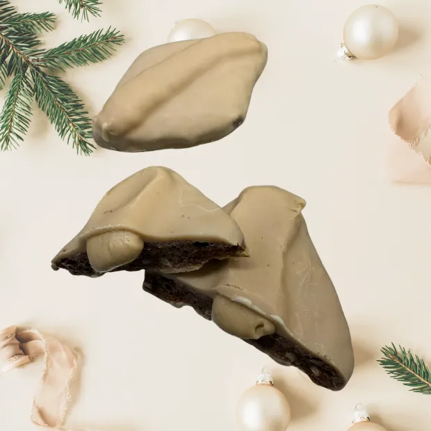 Ingredienti: amido di frumento deglutinato, destrosio fioretto di mais, fibre vegetali (barbabietola, psyllium), zucchero, stabilizzante: gomma di guar, emulsionante: idrossipropilmetilcellulosa), zucchero, miele, ammoniaca (E503), cacao amaro in polvere, acqua, granella di NOCCIOLE, pisto napoletano (coriandolo, cannella, chiodi di garofano, noce moscata). Farcitura: oli vegetali (girasole, palma), zucchero, NOCCIOLE, LATTE scremato in polvere, LATTOSIO, siero di LATTE in polvere, emulsionante lecitina (di SOIA), aromi. Ricoperto con cioccolato bianco, aromatizzato con pasta NOCCIOLA. (Allergeni: 7, 8)