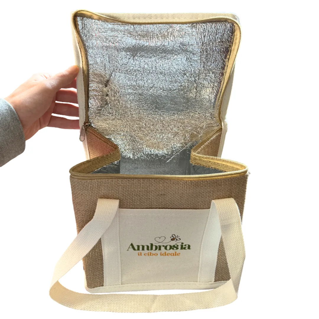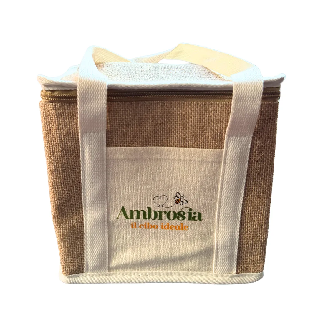 Progettata per essere pratica e leggera, è perfetta da portare al lavoro, in viaggio o durante gli spostamenti quotidiani. All’interno può essere inserito facilmente il ghiaccino fornito con l’ordine Ambrosia, aiutando a mantenere la temperatura ottimale degli alimenti più a lungo.