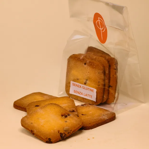 Ingredienti: farina di riso, farina di mais finissima, TUORLO, sale, zucchero a velo, margarina, vaniglia, gocce di cioccolato (pasta di cacao, burro di cacao, lecitina di soia, aroma naturale di vaniglia). (Allergeni: 3)