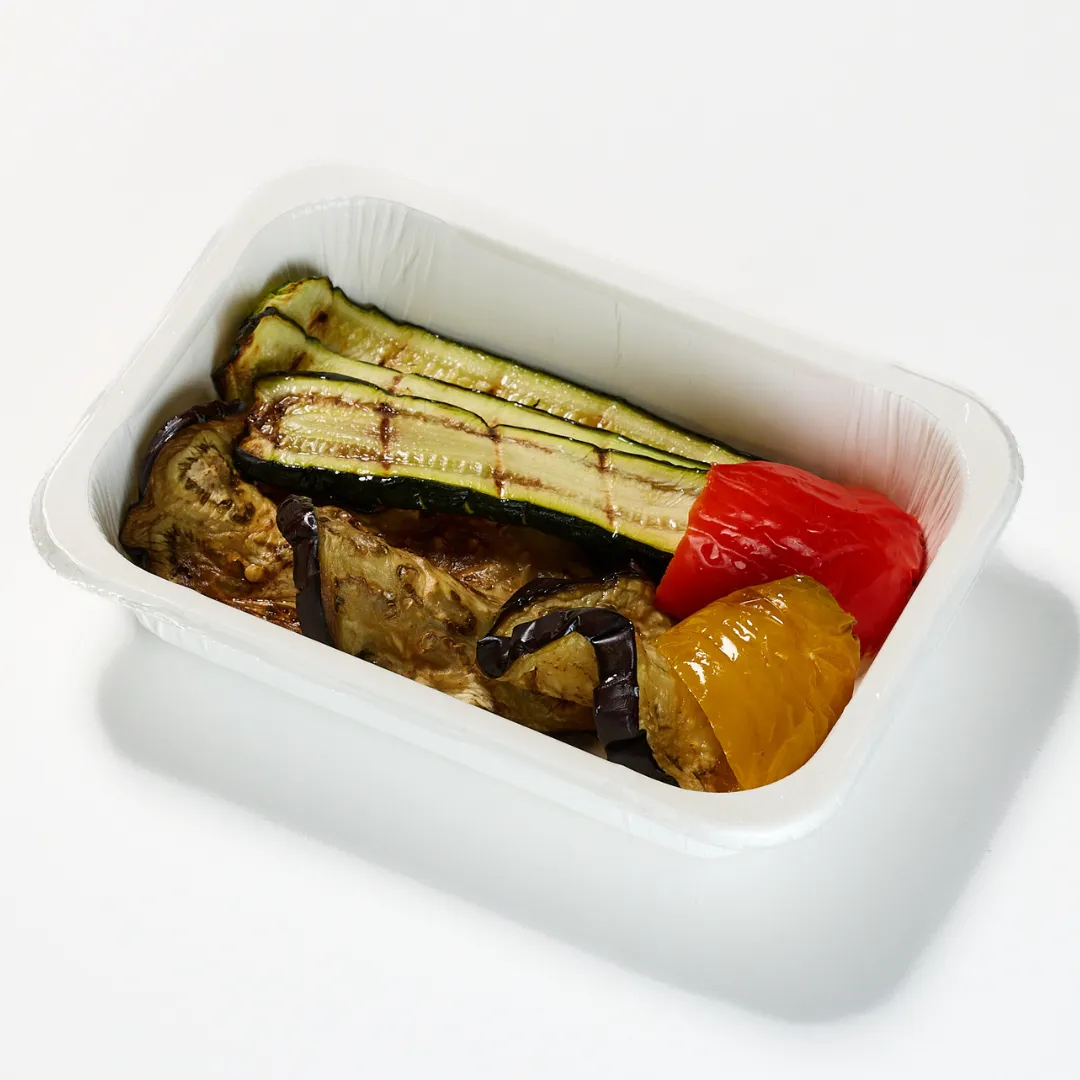 Ingredienti: verdure grigliate 86% (zucchine 38%, melanzane 32%, peperoni 16%), condimento [olio di oliva, sale, succo di limone (succo di limone , conservanti : E224, (contiene SOLFITI))]. (Allergeni: 12)
